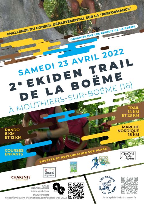 Après les 9 éditions précédentes, le Trail renaît à Mouthiers sous une forme inédite : l’Ekiden Trail de la Boëme ! L’ekiden est une course en relais à six se déroulant sur une distance d’un marathon classique (42,195km). Cette année, pour des raisons pratiques, la distance réelle de notre ekiden trail sera de 45km. Les six coureurs parcourront successivement les distances suivantes : 5km, 10km, 5km, 10km, 5km et enfin 10km.