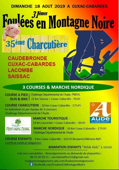 31èmes Foulées en Montagne Noire. Journée sportive et conviviale au cœur de la Montagne Noire avec marche touristique, marche nordique, courses à pied et Run&Bike de 22 km. Animation et courses enfants organisé pendant les fêtes du village de Cuxac-Cabardes.