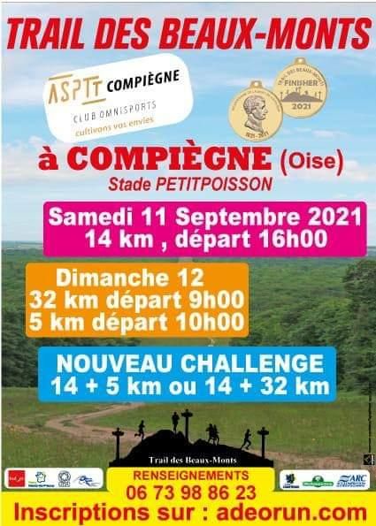 17ème édition du Trail des Beaux Monts est organisé par l’ASPTT Compiègne avec 3 parcours trail. Le circuit vous emmènera à travers la mythique allée impériale, sur les Beaux Monts ou le Mont St Mard ! Une épreuve à ne pas manquer.