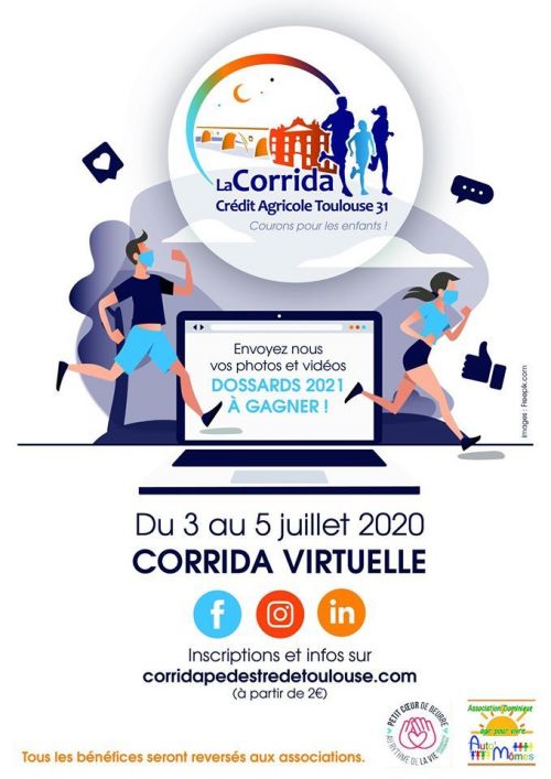 En raison du Covid-19, la Corrida 2020 est annulée. Afin de faire vivre l'esprit Corrida, nous avons décidé de mettre en place une Corrida Virtuelle. Aujourd'hui, plus que jamais, nous avons besoin de faire vivre la Corrida. Les organisateurs et bénévoles sont prêts. Les coureurs rêvent de pouvoir courir. Alors montrons, une fois encore, notre motivation et notre soutien à nos associations Petit Cœur de Beurre & Dominique.