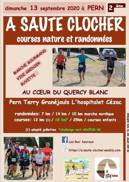 2ème édition de la course nature A Saute Clocher orgénisée par les Run'heureux. Une journée nature, patrimoine, sportive, conviviale, solidaire avec 3 parcours donc un Relais de 31 km en 3 étapes + final en équipe Une trail ouvert aux personnes présentant un handicap - Joëlette : 12,5 km