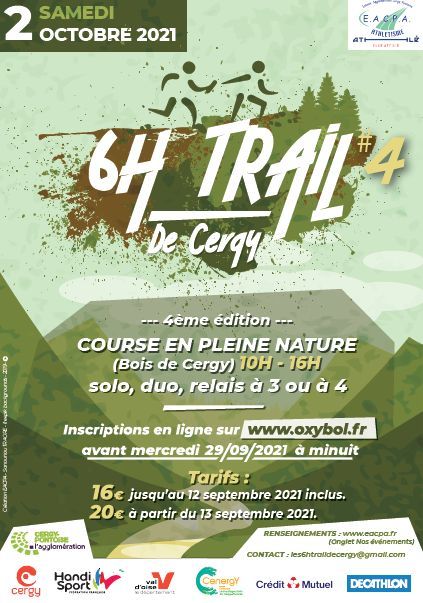 Epreuve d'endurance dont le but du jeu est de courir durant 6 heures, dans le Bois de Cergy, sur une boucle de 4.5 kms avec un dénivelé positif de 100 mètres, en solo ou duo, en équipe de 3 ou 4 ou encore en challenge entreprise/école/famille : un circuit 100 % Trail, 0 % bitume.
