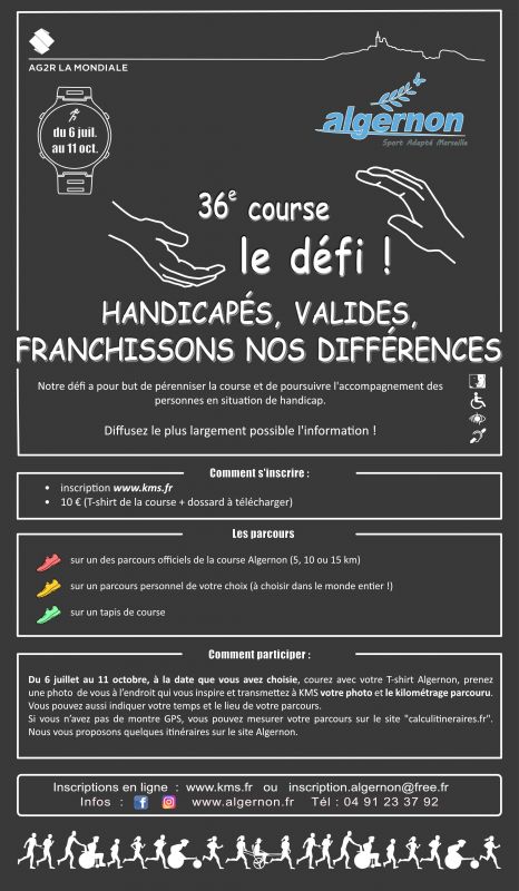 Pour participer, vous devez vous inscrire sur le site KMS, comprenant le T-shirt, à retirer suivant les modalités indiquées sur le site KMS. Vous pourrez également télécharger votre dossard. À la date que vous avez choisie, vous courez avec votre T-shirt Algernon, vous prenez une photo de vous à l’endroit qui vous inspire et vous transmettez à KMS votre photo et le kilométrage parcouru. Vous pouvez aussi indiquer votre temps.