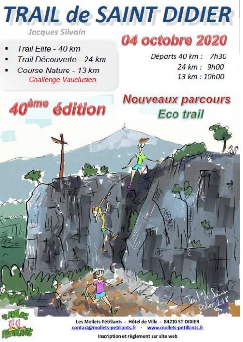 40ème édition du Trail de St Didier avec de nouveaux parcours Eco trail. Maximum de sentiers, technique, monotrace, points de vue dégagés... Seul le 13 km est inscrit au Challenge Vauclusien