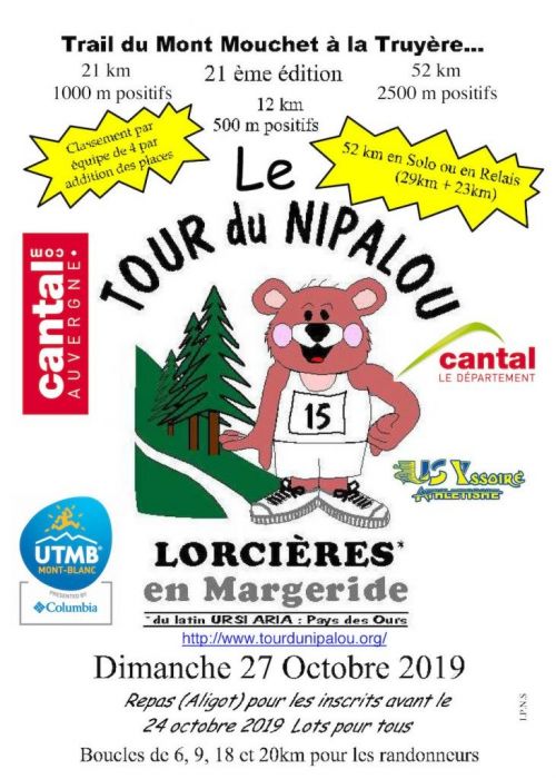 Le Tour du Nipalou aura lieu à Lorcières en Margeride (Cantal, Auvergne). Le 52 km de cette édition est qualificatif pour l'Ultra Trail du Mont-Blanc ou autres à hauteur de 3 points Endurance. Certification de l'ITRA