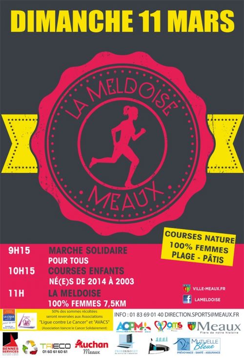 La Meldoise est la course nature solidaire officielle FFA que pour les filles. Elle se déroule sur 7500m depuis la plage de Meaux et dans le magnifique parc naturel du Pâtis. Petits points de bois, étang au cygne, plage de sable fin, pont suspendu, chemin bordant les champs et grande allées longeant La Marne : dépaysement garanti ! La Meldoise est aussi une épreuve solidaire contre le cancer avec versement d’une partie des frais d’ inscription et vente d'objets : chacun est invité à jouer le jeu : coureurs et spectateurs !