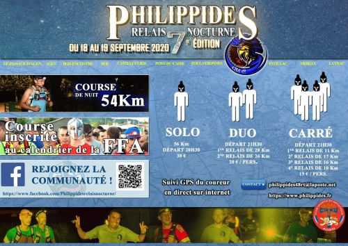 Philippidès est une course de nuit d’environ 55 km autour de la ville d’Agen (47). Le circuit traverse les communes de : Pont-du-Casse, Foulayronnes, Agen, le Passage-d ’Agen, Rochefort, Estillac, Moirax, Layrac, Castelculier, Boé et Bon-Encontre.