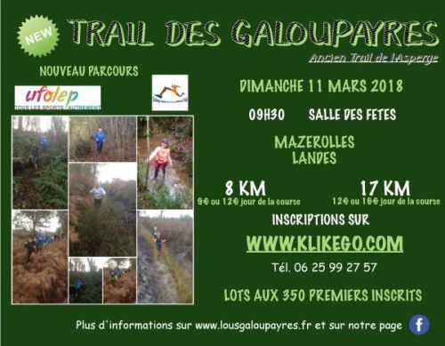 Anciennement Trail de l'Asperge , le Trail des Galoupayres saura toujours vous accueillir et vous faire découvrir la forêt et les coins cachés autour du village de Mazerolles. Les 350 premiers inscrits auront une dotation et les récompenses comme chaque année seront nombreuses (ce qui fait la particularité de cette course depuis toujours).