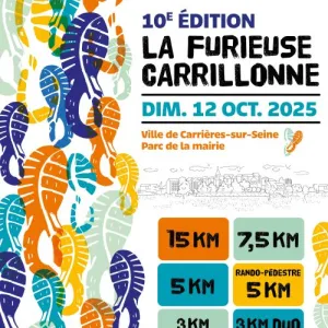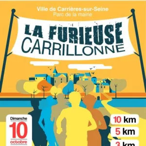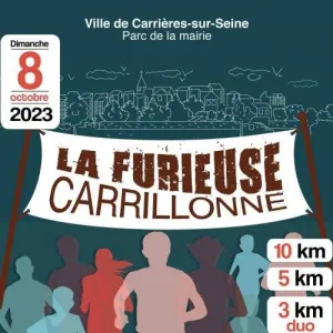 L’association « Les Furieux du bitume » organise en partenariat avec la ville de Carrières-sur-Seine la manifestation « La Furieuse Carrillonne ». Sont prévues une course de 10 km, une course de 5 km, et une course de 3 km incluant une course famille (un adulte accompagné d'un enfant de moins de 12 ans à vélo). Nous espérons retrouver vos sourires et votre bonne humeur de l'édition précédente. Vous étiez plus de 450 participants l'année dernière pour cette course furieusement festive, alliant effort et convivialité. Participants de 4 à 78 ans, vous nous aviez offert une belle image du sport avec un état d'esprit formidable !