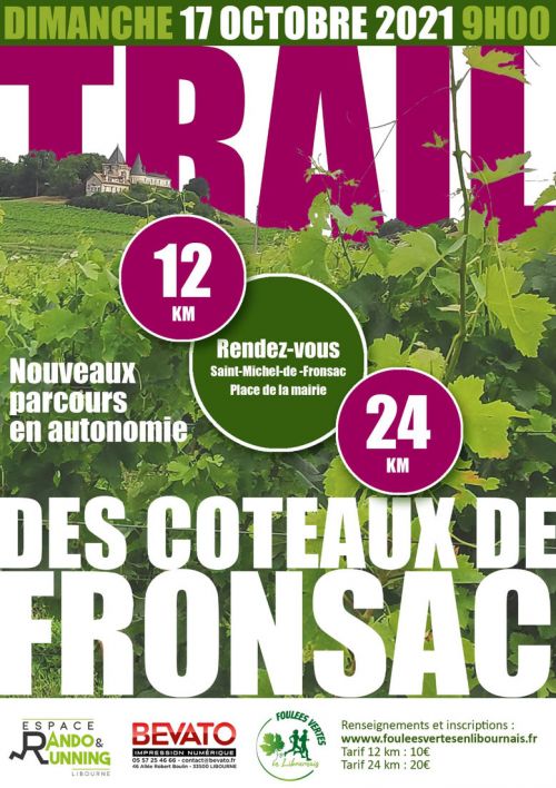 Course nature traversant les vignobles de Fronsac avec des passages dans bois et sous bois. Pour les coureurs, 2 distances sont proposées à travers chemins et sentiers : 12kms et 24 kms. Les courses seront en semi-autonomie avec plusieurs ravitaillements uniquement avec de l'eau sur la course. La possibilité est offerte aux marcheurs d'utiliser le petit parcours (12 kms) pour une randonnée libre ; les coureurs restent toutefois prioritaires.