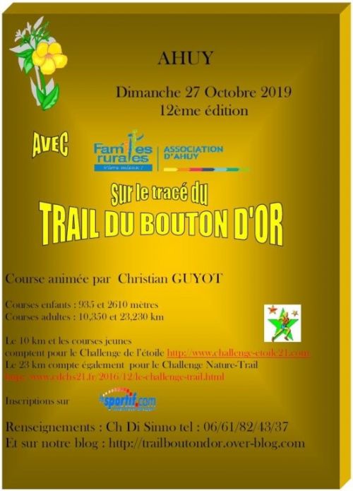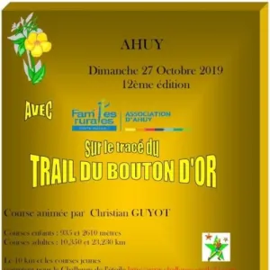 Ahuy et ses environs bénéficient d'un site naturel privilégié, qui convient très bien à ce type de manifestation sportive. Les sentiers retenus pour le tracé traversent des bois, des combes, des zones agricoles... Des dénivelés relativement courts mais raides permettront aux sportifs de faire preuve de leur talent. Une partie de tracé emprunte le sentier du Bouton d'or qui parcourt notre région sur environ 100 KM. Evidemment, en octobre, les boutons d'or ne seront pas fleuris le long des sentiers, mais si vous vous promenez au printemps vous les verrez en abondance avec bien d'autre variétés de fleurs et de plantes. Dans ce beau paysage, nous accueillerons donc les grands sur deux parcours de 10 et 23 km, et les plus jeunes, sur 1 et 3 km. Les épreuves jeunes et le 10 km comptent pour le Challenge de l'étoile. Le 10 km compte également pour le Challenge trail.