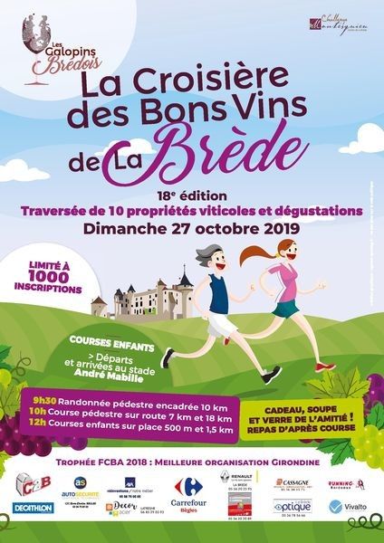 La Croisière des Bons Vins de La Brède : Courses pédestres de 7km ou 18km avec visite de 10 châteaux viticoles (dégustations). Randonnée pédestre encadrée de 10km. Inscriptions sur place avec soupe et verre de vin à l’arrivée. Courses enfants gratuites et sans classement sur 500m et 1,5km avec des départs à partir de 12h00. Inscriptions sur place.