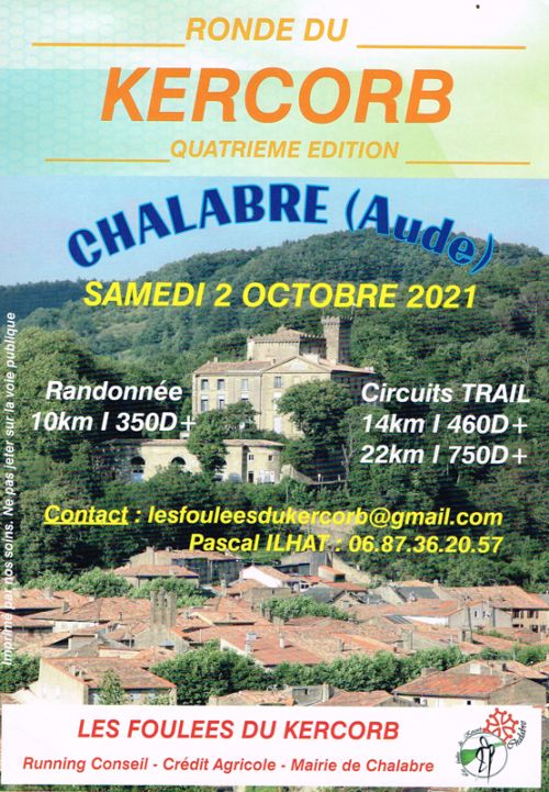 L’Association « Les Foulées du Kercorb » organise un ‘trail découverte’ de 13 km , un trail court de 21 km ainsi qu’une randonnée pédestre de 13 km sur la commune de Chalabre. Les départs seront donnés respectivement à 10h00 et 9h00 et 9h15 depuis la place du village de Chalabre.