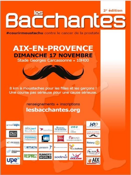 Les Bacchantes Aix-en-Provence vous invite à vivre une course pas comme les autres, sur un parcours de 8 km ouvert aux filles et aux garçons (à partir de 16 ans), entre amis, entre collègues ou en famille. Outre la convivialité et le don de soi, tous les participants sont soumis à un dress code : le port de la moustache… naturelle, fausse, collée ou dessinée. Les fonds collectés à l’occasion de cette course seront intégralement reversés à l’Association Française d’Urologie (AFU).