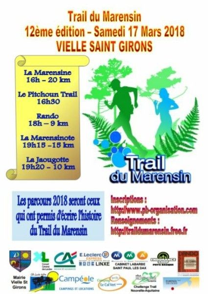 12 ème édition du Trail du Marensin. Rendez-vous à la salle des Fêtes de Saint Girons le Samedi pour la remise des dossards et le Pitchoun trail, la rando, la Marensine et la Marensinote et la Jaougotte en semi-nocturne.