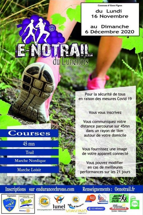 Course ludique (fanfare et déguisements), culturelle (traversées de châteaux), sportive (environ 150m de D+), dégustative (clin d'oeil aux vins du lunellois) et caritative puisque qu'au profit de l'illettrisme et des maladies respiratoires, l'Oenotrail installe son village départ/arrivée au pôle oenologique Viavino et se décline en 4 courses (trail court, trail découverte, marche nordique et marche). Une bouteille de vin et une part de fougasse géante offertes à tous les participants.