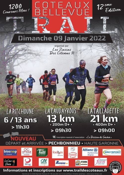 Les Zinzins des Coteaux 31 vous donnent rendez-vous pour une nouvelle édition du Trail des Coteaux Bellevue, rendez-vous incontournable de début d'année pour les coureurs et traileurs de la région toulousaine et d'ailleurs ! 3 distances sur des parcours vallonnés à travers les champs et forêts de Pechbonnieu, St Loup Cammas, Montberon, et des communes environnantes. Ces parcours sont reconnus comme plutôt humide et boueux.