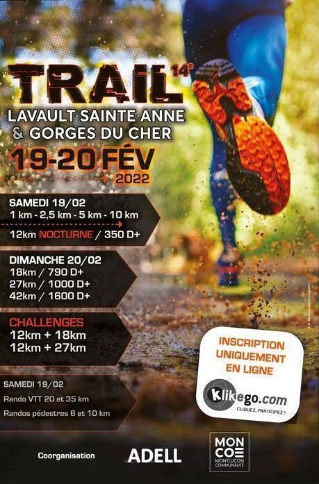 Le TRAIL de Lavault-Ste- Anne et des gorges du Cher a lieu sur un parcours accidenté où tous les ingrédients sont réunis pour découvrir ce remarquable site de la vallée du haut cher. Le samedi à partir de 16h00 toutes les courses non classantes (1km, 2,5km, 5km et le 8km découverte). À 18h30 trail nocturne de 12km suivie d’une pasta party. Le dimanche courses classantes avec un 15km, 25km et un nouveau parcours de 42km. Il y aura la possibilité pour ceux qui le souhaitent de faire le challenge, autre nouveauté cette année, en cumulant deux courses. Le 12km du samedi avec le 15km du dimanche.