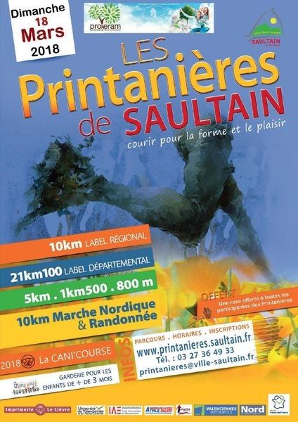 Une course à ne pas manquer. Au programme, des parcours diversifiés et spécifiques à chaque coureur : une course de 800m, de 1,5km, de 5 km et de 10km avec label régional un semi-marathon avec label départemental ainsi qu'un cross canin de 5 km. Alors, nous vous attendons aussi nombreux que l'année dernière, et toujours aussi déterminés à participer à cette merveilleuse tradition qu'est l'événement des Printanières de Saultain.