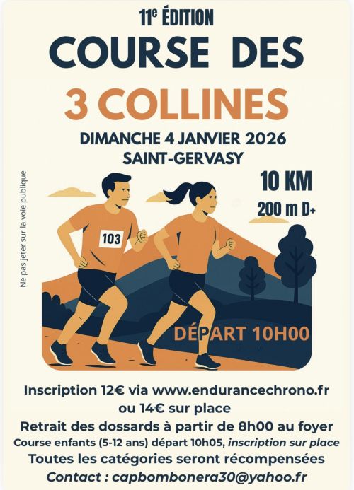 La course des 3 collines vous offrira la possibilité d'emprunter 2 parcours à Saint Gervasy. De part leurs parcours vallonnés et variés qui traversent les 3 collines surplombant le village de Saint-Gervasy à travers la garrigue. Ces 2 parcours utiliseront près de 80 % de chemins, le premier dimanche de janvier. Cette manifestation pédestre peut être considérée, en début de saison, comme une première étape de préparation aux événements sportifs de la saison à venir.
