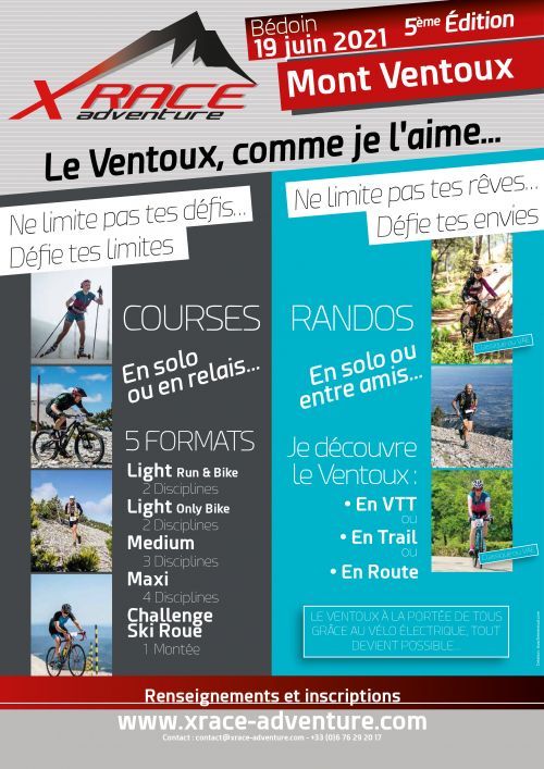 4 sports, 4 ascensions du Ventoux , 5 formats de 2 à 4 ascensions à faire en solo ou en relai la light run & bike : trail + vélo route la light only bike : VTT + route la medium : VTT + trail + route la maxi : ski roue + VTT + trail + route la montée ski roue
