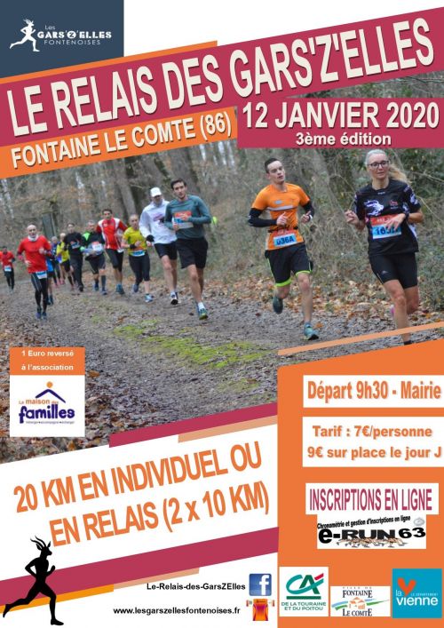 Les Gars’Z’Elles Fontenoises organisent pour la première fois une course sur Fontaine le Comte (86), "Le Relais des Gars’Z’Elles". L’unique tracé de 20 Km, 60% de route, peut se parcourir en individuel ou en relais de deux fois 10 km. Le relais aura lieu au Village Loisirs (ancien site Auchan) à Fontaine le Comte (86) avec un transport sur le site de transition mis en place par les organisateurs. Le retour du premier relayeur sera également pris en charge par l’organisation. L’objectif de notre association est de proposer une course technique et festive qui plaira autant aux compétiteurs qu’aux coureurs souhaitant débuter d’un bon pied la nouvelle année.