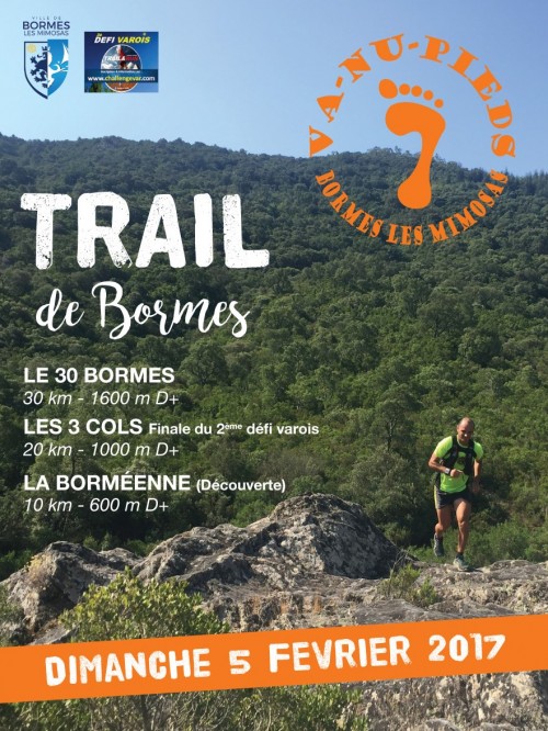 Depuis sa création en 2006, le Trail de Bormes est devenu un rendez-vous incontournable de début d'année, pour les amateurs de trail. La manifestation a évolué avec aujourd'hui 3 formats de courses : le 30 Bormes (30 km) , Les 3 cols (20km), La Borméenne (10km). Ces 3 courses, au départ du vieux village de bormes permettent d'évoluer au travers des collines varoises typiques, riches de mimosas avec la mer à perte de vue, les îles d'or et même un panorama sur les Alpes.... Un tracé magnifique pour une manifestation unique! De plus en plus de grands noms du TRAIL viennent se tester sur ce trail, désormais inscrit dans le challenge du défi varois. Venez-vous surpasser à votre tour, un format de course sera forcément adapté à votre niveau et à vos ambitions!