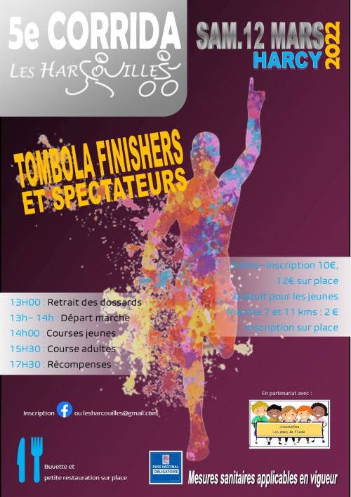La Corrid'Harcy sur un parcours avec routes fermées, trois boucles égales avec un passage dans un chemin boisé .Un relais en équipes de trois coureurs est également proposé.