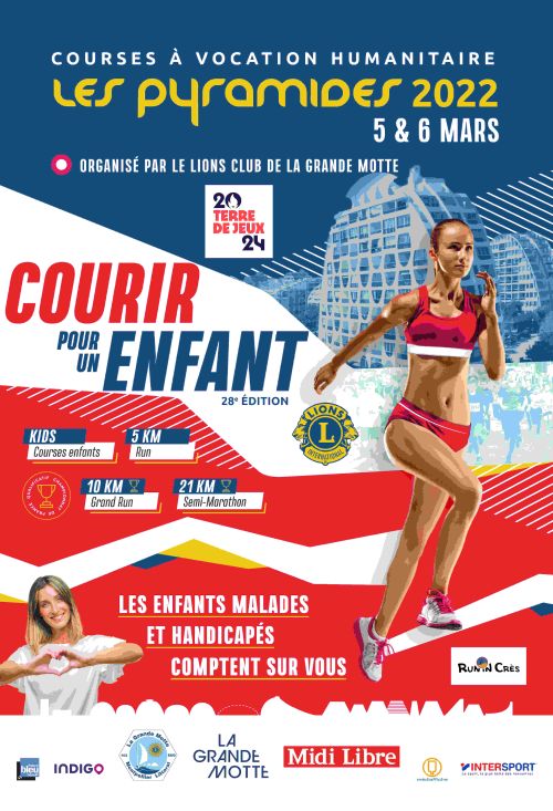 Courses les Pyramides qui se dérouleront à la Grande Motte. Elles sont organisées par le Lions Club de La Grande Motte en collaboration avec la ville de La Grande Motte et Midi Libre. Le départ des courses sera donné Avenue Robert Fages à la Grande Motte, les arrivées, se feront sur la même ligne que les départs. Parcours plat et roulant sur route et piétonniers, étang, golf et retour en front de mer