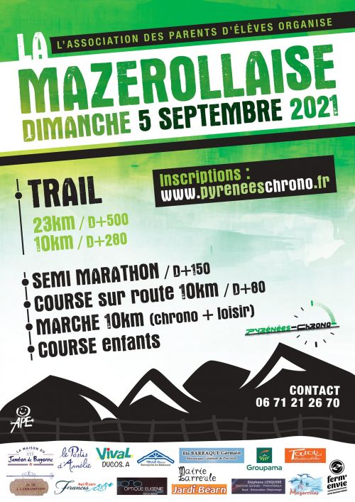 L'APE de Mazerolles organise la 2ème édition de La Mazerollaise. Cette année vous évoluerez sur des nouveaux parcours!Plusieurs distances vous seront proposées: un trail de 22kms , un de 16kms, et un de 10kms, nous vous proposerons aussi une marche chrono et une marche loisir de 10kms.