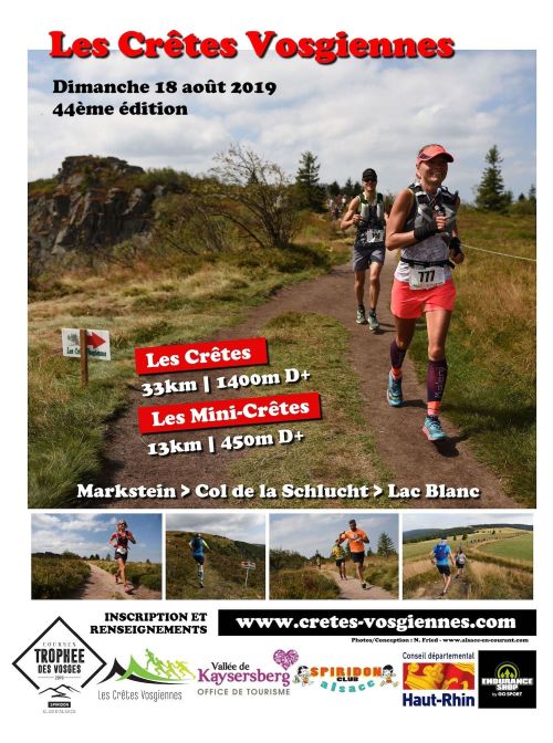 45ème édition des Crêtes Vosgiennes, course de montagne inscrite au Trophée des Vosges. Les Crêtes Vosgiennes sont devenues une épreuve mythique dans le monde de la course à pied. L’exigence du parcours et la beauté des paysages ont définitivement établi sa réputation. L’intégralité du parcours emprunte des sentiers pittoresques (GR5) et offre une vue imprenable sur les Vosges et la plaine d’Alsace.