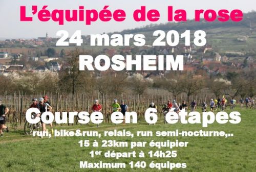 Course en 6 étapes par équipes de 3. Départ en ligne à chaque étape pour des parcours nature dans les environs de Rosheim. Etape bike&run, relais en escadrille, étape semi-nocturne. Selon l'étape de 1 à 3 coureurs sont en course, soit env. 15 à 21km par équipier en 2 ou 3 étapes. L’Equipée de la Rose est avant tout un moyen ludique et convivial pour découvrir le superbe terrain d’entrainement de l’association “Rosheim Running”. Cat. autorisées CA->V5.