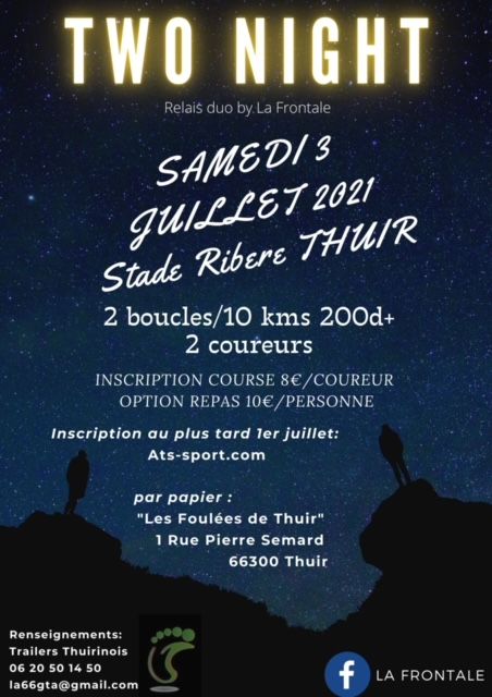 Course de nuit en relais de 10 km par participant sur un circuit aux alentours de la ville de Thuir , dénivelé de 200 m. Frontale obligatoire. Repas d'après course
