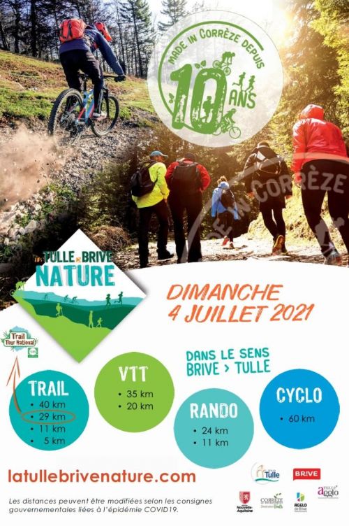 Aprés un départ de Brive vous arriverez dans le majestueux canal des moines, pour rejoindre Sainte Fortunade, puis un autre site exceptionnel le cascades du salabert , vous en prendre pleins les yeux.. puis arrive le magnifique village à travers le temps de Gimel les cascades, un des plus beaux sites naturels de la Corrèze un passage au sein d'églises et château historique, vous parcourez les chemins et des pistes monotraces pour rejoindre Bar par de nombreux sentiers qui vous permettrons de découvrir la beauté et la diversité des paysages. Ce sera l'occasion d'aller découvrir en dehors du bourg, le site religieux de Chastres. Cette charmante petite chapelle a été construite sur une excavation où l'on aurait découvert une statue de Notre Dame. Puis ensuite le retour sur Tulle par des chemins à travers bois et traverserez enfin la Corrèze sur le parc de l'Auzelou avec un lieu d'arrivée festif pour cette 10ème éditions.