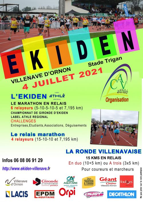 Le départ sera donné à 9h pour l'ékiden. Les équipes sont composées de : 6 femmes pour les équipes femme, 3hommes et 3 femmes pour les équipes mixte, 6 vétérans homme pour les équipes vétérans, tous les autres cas étants des équipes homme. Des classements annexes de 6 jeunes ou étudiants (nés de 1994 à 2002, voir 2003/2004 sur le 5km) ou entreprise ou associations, collectivités et entreprises Villenavaises, les autres configurations ne donnant pas lieu à podium.