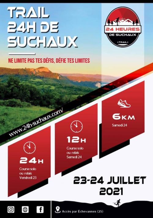 Le trail des "24 Heures de Suchaux" est une course à allure libre d’endurance par élimination, qui se déroule en individuel ou en équipe, le tout sur une boucle de 6 km pour 300m de dénivelé positif. En individuel ou relai de 2 ou 3 personnes , sur 12h, 24h ou cross de 6km, choisissez le format qui vous conviendra le mieux afin de vous dépasser et terminer un maximum de boucles !