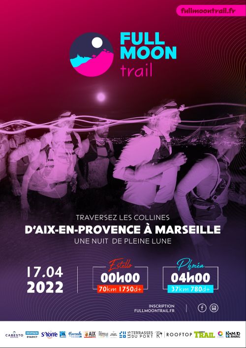 Full Moon Trail, c'est un trail sous une nuit de pleine lune. On vous emmène pour une traversée nocturne de 70 kilomètres, magique et lunaire dans les collines de Marcel Pagnol, depuis Aix-en-Provence la sereine, jusqu’à Marseille la rebelle. Marseille que les traileurs les plus en en forme viendront réveiller avec le soleil, et que les contemplatifs trouveront déjà bien réveillée. Un autre format de course de 37 kilomètres est également disponible.