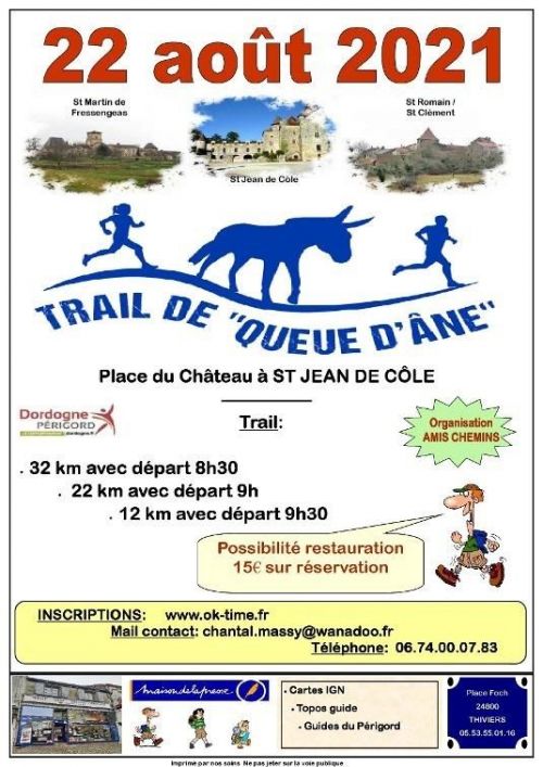 Trail de Queue d'Ane avec un parcours de 30 ou 12 km qui emprunte les chemins des communes de Saint-Jean de Côle / Saint-Martin de Fressingeas /Saint-Romain et Saint-Clément.
