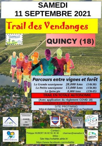 Le Trail des vendanges est organisé par le club VVF ATHLE, les communes de QUINCY, BRINAY, PREUILLY, CERBOIS et les associations de Quincy. Le Trail des vendanges est un évènement sportif proposant trois épreuves de course et une marche nordique de pleine nature entre les villages de Quincy, Brinay, Preuilly traversant les vignobles et la forêt.