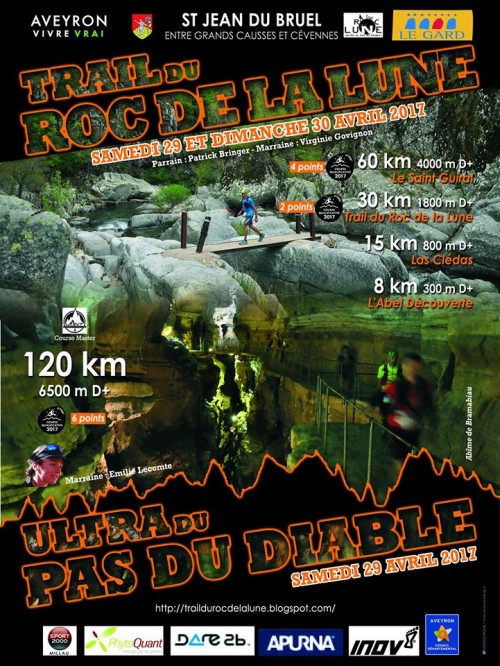 Pour la 10ème édition du Trail du Roc de la Lune et vous proposer de tous nouveaux parcours mais aussi pour remercier les Communes qui accueillent l’Ultra du Pas du Diable avec plaisir et dévouement 2 départs seront donnés au cœur de 2 magnifiques petits villages du Gard. Le départ du 60 km (St Guiral) sera donné de Dourbies le samedi 29 avril à 9 heures et le départ du 30 km (Roc de la Lune) sera donné d’Aumessas le dimanche 30 avril à 9 heures. Pour acheminer les participants, des navettes seront mises en place depuis St Jean du Bruel au tarif de 3,50€.