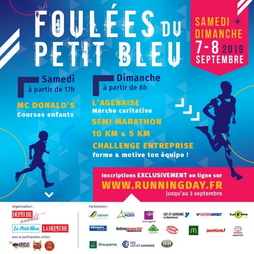 Le coeur d’Agen va battre au rythme des Foulées martelant l’asphalte. Trois Grand’Bleu dont les départs et les arrivées se feront sur l’esplanade du Gravier sont au menu. Dès 9 heures , s’élancera un 5 kilomètres réservé aux femmes et aux hommes nés en 2004 et avant. Puis à 10 h 30, partira, lors d’un départ commun sur un parcours officiellement mesuré un 10 kilomètres et un Semi-Marathon, pour les participants nés en 2002 et avant pour le 10 kilomètres, et nés en 2000 et avant pour le Semi-Marathon. Des catégories Minimes à Vétérans 4, des femmes aux hommes, des premiers aux troisièmes, ce sont plus de 120 participants qui seront honorés. Un Challenge Entreprise et un Association/Club viendront récompenser l’implication du tissu économique et sportif dans les Foulées du Petit Bleu.