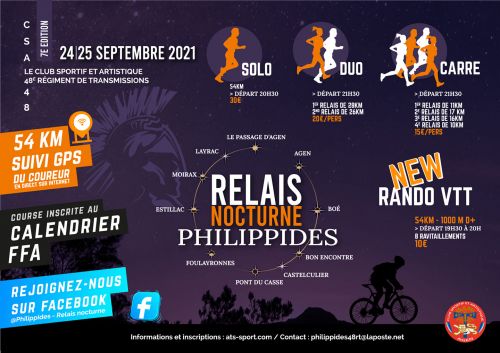 Philippidès est une course de nuit d’environ 55 km autour de la ville d’Agen (47). Le circuit traverse les communes de : Pont-du-Casse, Foulayronnes, Agen, le Passage-d ’Agen, Rochefort, Estillac, Moirax, Layrac, Castelculier, Boé et Bon-Encontre.