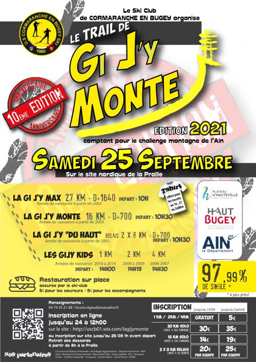 Le Ski Club de Cormaranche en Bugey organise la 9ème édition du trail La Gi J'y monte sur le magnifique site de la Ferme Guichard. Peut se courir en relais de 2 coureurs ou en solo.