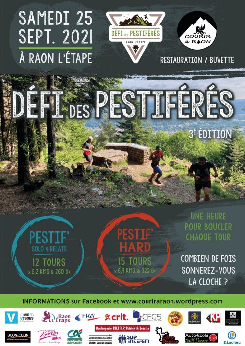 Le Défi des Pestiférés avec deux défis : la PESTIF’ en solo ou en relais a répéter 12 fois maximum, et la PESTIF’HARD sur une boucle chronométrée de 6,9 kms et 320m de dénivelé positif sur des sentiers balisés répéter 15 fois maximum.