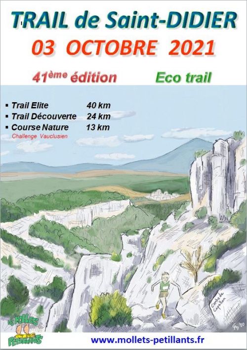 Trail de St Didier avec de nouveaux parcours Eco trail. Maximum de sentiers, technique, monotrace, points de vue dégagés... Seul le 13 km est inscrit au Challenge Vauclusien
