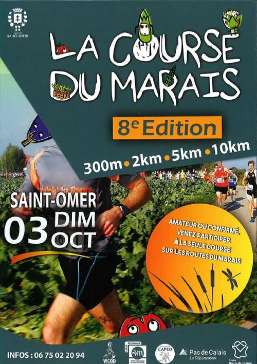 La Course du Marais se compose de deux parcours : l’un de 10 km, l’autre de 5km. Des courses de 300m à 2km sont également prévues pour les jeunes (des mini-poussins à benjamins). Départ et arrivée Place de la Ghière à Saint-Omer.