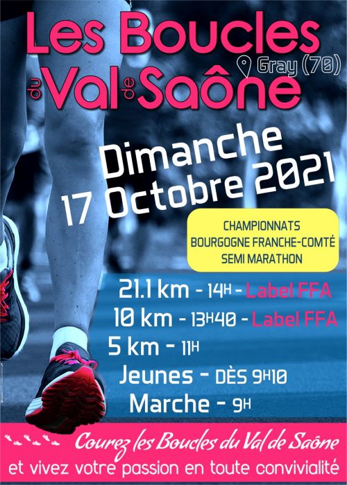 Le semi marathon se déroule sur une seule boucle, parcours agréable mi urbain mi-campagne longeant les rives de la saône sur plusieurs kms. côte de 400m après le premier km, ensuite légèrement descendant ou plat jusqu'à l'arrivée. Catégories autorisées JU->V5.