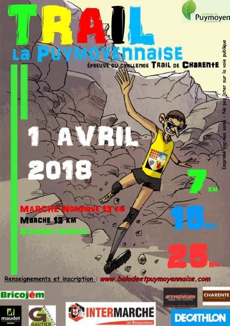Parcours dans la vallée des eaux claires, sur les sentiers de sous bois sur les falaises, les rochers. Parcours de 25 km, dénivelé de 493 m en une seule boucle, départ à 9 h , salle des fêtes de Puymoyen Chrono à puces. Accueil convivial à partir de 7h0 Retrait des dossards à partir de 7 h.30 Récompense aux 3 premiers H et F . Aux premiers de chaque catégorie H et F. Cadeau de bienvenue à chaque participant. Catégories autorisées JU->V5.