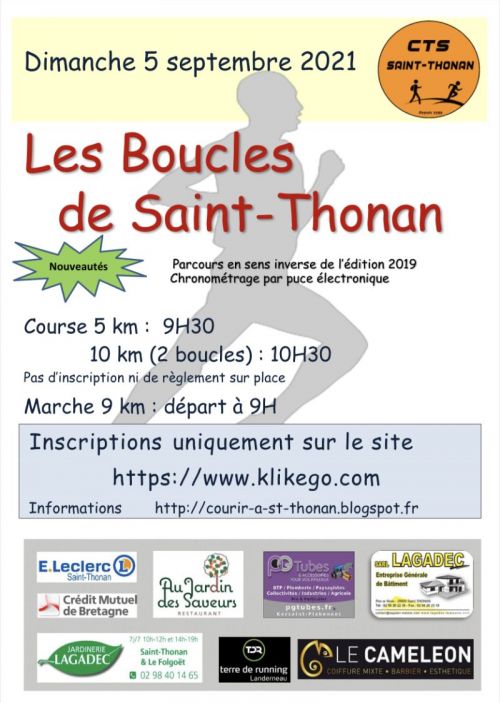 Les Boucles de Saint Thonan, avec 2 parcours sur un circuit ne présente pas de difficulté particulière, accessible à tous, même à ceux qui n'ont pas l'habitude de courir en compétition. Vous découvrirez en plus de la campagne saint thonanaise, et une ambiance conviviale.