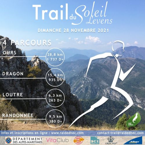 Le trail du soleil Levens organisé par l’association raid edhec, se déroulera à levens, près de nice, avec 700 participants attendus. 4 parcours trail seront proposés et une randonnée de 9,5km.
